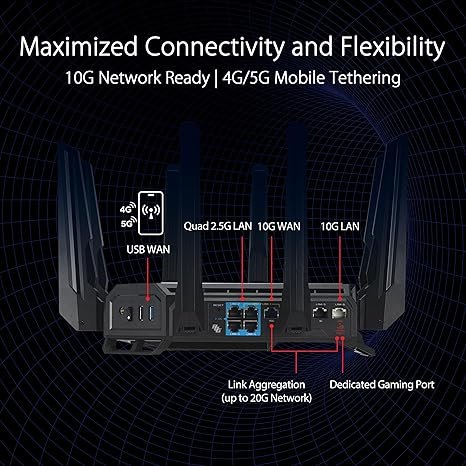 ASUS ROG Rapture GT-BE98 PRO First Quad-Band WiFi 7 Gaming Router supports 320MHz, Dual 10G Port, Triple-level Game Acceleration, Mobile Game Mode, Subscription-Free Security, AiMesh, and VPN features